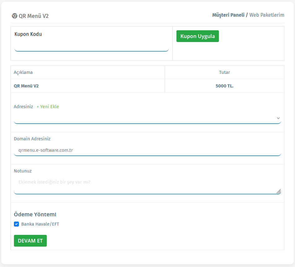 Kurulum Bizim Sunucularımızda Barındırılması için Domain Kısmına " qrmenu.e-software.com.tr " Yazılmalıdır.