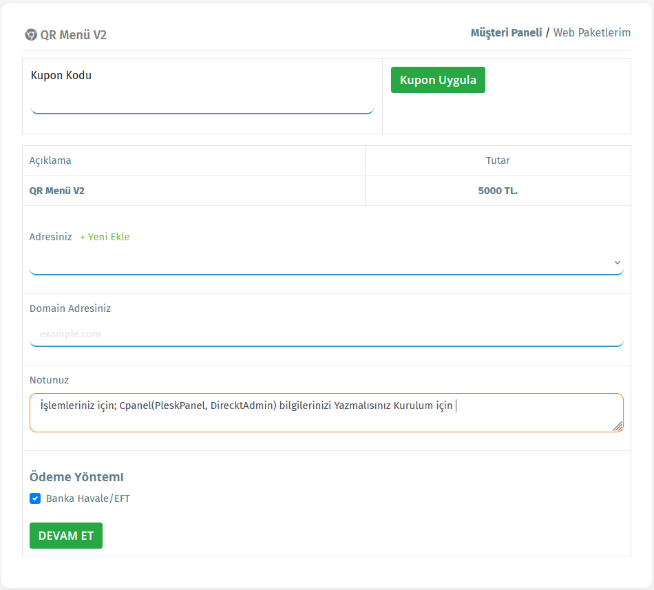 Kurulumu Sizin Domaine Yapmamızı isterseniz Notunuz Kısmına " Cpanel, PleskPanel, DirecktAdmin " Bilgilerinizi İletmeniz Gerekmektedir.