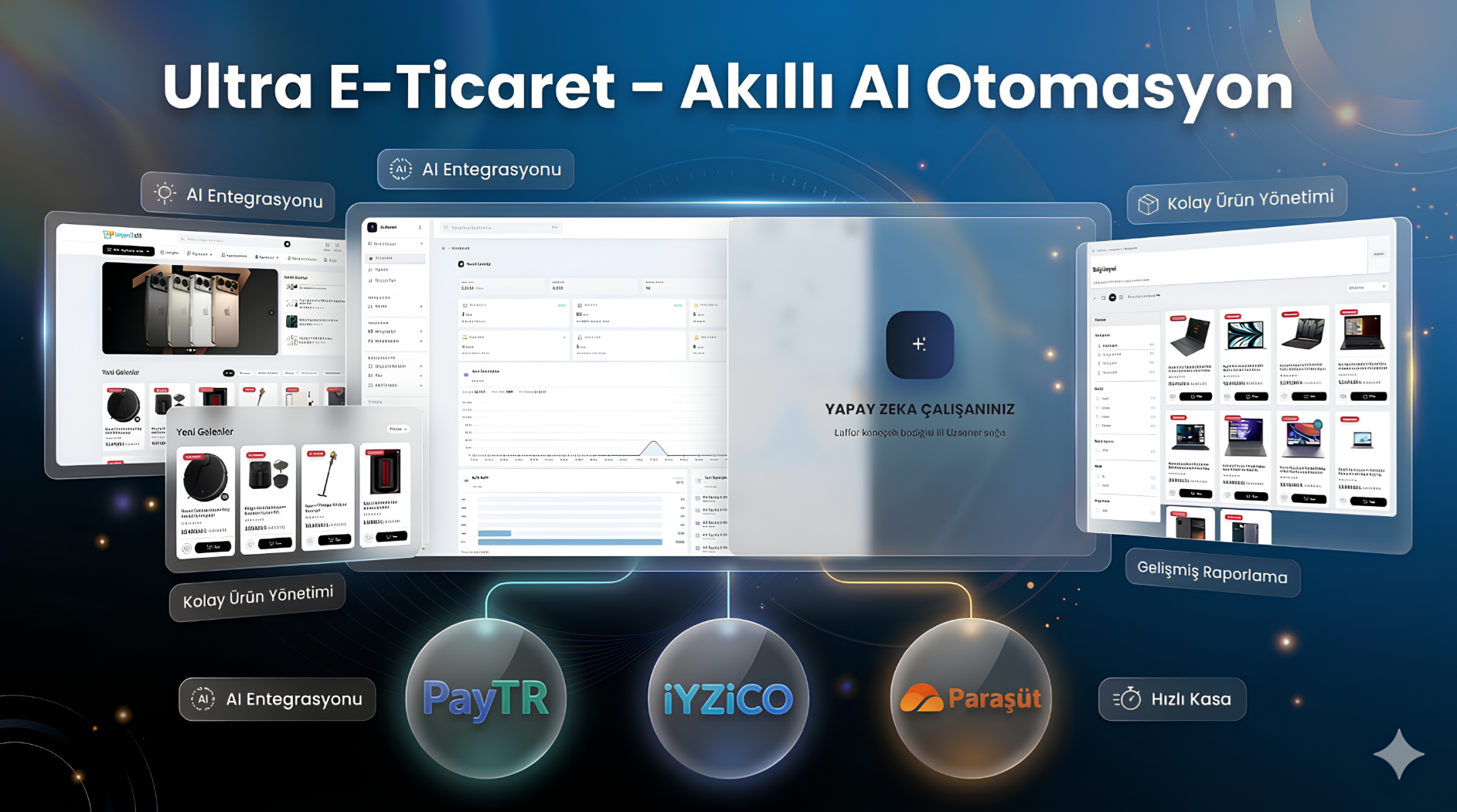 Ultra E-Ticaret – Akıllı AI Otomasyon, klasik bir e-ticaret altyapısından çok daha fazlasını sunan, gerçek anlamda otonom çalışan yeni nesil bir ticaret platformudur. Sistemin merkezinde yalnızca ürün listeleyen bir yazılım değil; karar veren, analiz yapan, içerik üreten, fırsat yakalayan ve dönüşüm oranını sürekli iyileştiren dijital bir operasyon aklı bulunur. 5 bağımsız yapay zekâ personeli; merkezi yönetim paneli, akıllı otomasyon motoru ve dönüşüm odaklı vitrin altyapısıyla birlikte mağazanızı 7/24 büyütmek için çalışır.